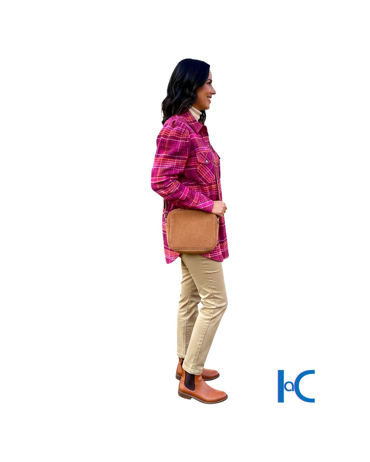 The garment is a vibrant magenta and orange plaid button-down featuring a Western-style yoke and gathered shoulders. It strikes a balance between rugged Americana and feminine detailing. It's bold, multi-tonal plaid shirt with classic Western tailoring, featuring dual chest pockets, a pointed back yoke, and slightly puffed sleeves for a modern silhouette.